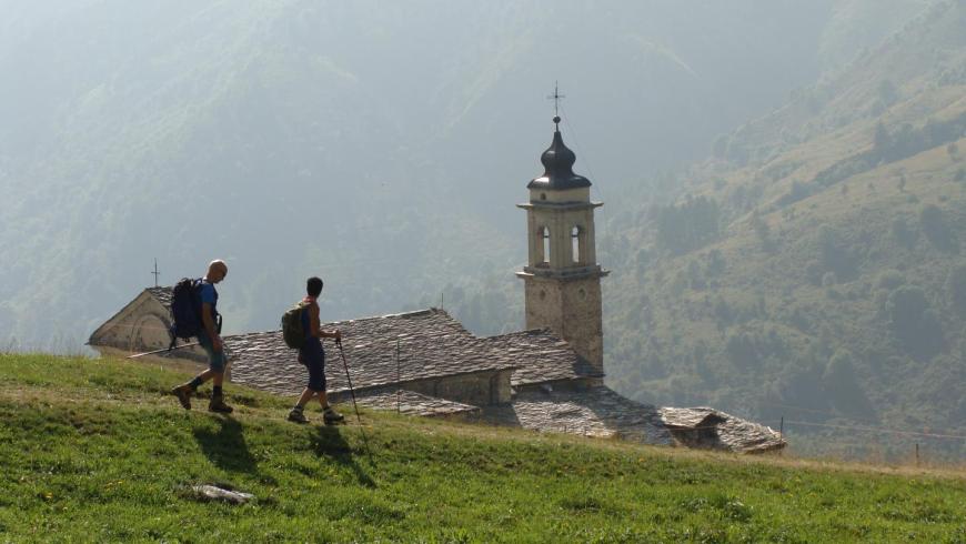 A sinistra della parrocchiale si imbocca il sentiero (Percorsi Occitani e GTA) che sale a mezzacosta attraversando un vallone fino a raggiungere un costone panoramico con edicola votiva e una croce in legno. Un ultimo tratto in salita nel bosco porta a Castellaro (1449 m).