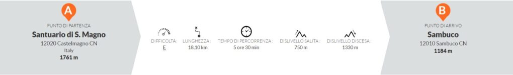 Dal Santuario si riprende la strada verso il Colle di Esischie, seguendo il percorso R54. Prima di un ponte sul Torrente Grana a quota 2015 si devia a sinistra per percorrere un tratto di sentiero in sponda idrografica destra fino a rispuntare sulla strada presso le baite del Gias Fauniera a 2180 metri. Si continua quindi lungo la strada arrivando nei pressi del Rifugio Fauniera (ex Trofarello) recentemente ristrutturato (2305 m.) Qui si lascia la strada ex-militare che continua per il soprastante Colle D’Esischie imboccando a sinistra il sentiero R55. Si taglia il largo tornante e si ritorna sulla strada per raggiungere in breve il Colle Fauniera o Colle dei Morti (2481 m), il cui nome è dovuto ai moltissimi soldati caduti in una sanguinosa battaglia della guerra di successione austriaca, quando nel 1744, i franco-spagnoli oltrepassarono il limitrofo Colle Valcavera per dirigersi ad assediare la città Cuneo. Da qui seguendo la strada si raggiunge infatti velocemente in piano il Colle Valcavera (2416 m), da cui la strada continua scendendo nel Vallone omonimo verso Demonte. Si imbocca invece il percorso P34 che inizia a scendere su ampi ripiani erbosi incrociando più in basso un tratto di pista fino al sottostante Gias Chiaffrea (2270 m). Si taglia su sentiero un tornante e si ritorna quindi sulla pista scendendo entro il vallone Chiaffrea fino a Grange Bastiera dove sorge il Bivacco Don Martini (2067 m). Si continua a scendere sulla sponda idrografica sinistra del rio che si incassa, ci si lascia sulla sinistra la deviazione per il Monte Nebius e si giunge al Gias Mure (1831 m). Da qui il sentiero segue il Vallone della Madonna che in questo settore assume la conformazione di una forra. Si scende a lato di una bella cascata con stretti tornanti su detrito coprendo il dislivello della soglia in roccia corrispondente. Giunti alla base del costone inizia un mezzacosta su materiale detritico con alcuni rii incisi e soggetti a valanghe che spesso danneggiano il sentiero nel periodo invernale costringendo a passaggi un po difficoltosi. Il tracciato continua a scendere poi entro il bosco molto fitto e umido che colonizza il versante prospiciente il rio fino ad una passerella in legno che lo attraversa a quota 1230 circa. Da qui si segue una pista sterrata fino alle prime case di Sambuco.
