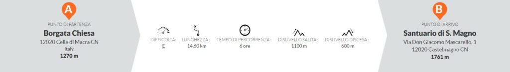 Presso un fontanile al termine della borgata si segue nuovamente il sentiero S22 che sale progressivamente entro una zona di ex-coltivi ora invasi da vegetazione, fino a incontrare la strada pastorale che proviene dalla stessa borgata facendo un giro più lungo. Si segue la pista verso destra fino ai 1740 metri della grangia Fumei dove ha termine. Si continua quindi sul sentiero segnalato che sale fino nei pressi del Monte Bastia (2134 m), scende brevemente per risalire verso il Bric delle Mendie. Prima di raggiungerlo, il sentiero piega a destra per contornare le cime del Bric e della successiva Rocca Cernauda. Si prosegue in mezzacosta attorno a quota 2200 con lievi saliscendi tra ampie praterie pascolive fino alla Bassa di Narbona con gli edifici delle Grange Serra (2220 m). Da qui si procede quasi in piano costeggiando a mezzacosta il versante est del Monte Tibert. Si attraversa un impluvio molto incassato e valanghivo per poi proseguire lungo un tratto a mezzacosta su versante ripido e franoso con qualche passaggio difficoltoso a seguito di smottamenti lungo il versante . Si giunge infine al Passo delle Crosette (2180 m) posto sul crinale tra la Valle Grana e il Vallone di Narbona, da cui si inizia a scendere lungo il sentiero R13 segnalato da picchetti nei pascoli che, dopo un primo tratto in traverso verso destra, inizia a scendere decisamente a tornanti verso un primo gias sottostante. Da qui si prosegue in discesa lungo un impluvio fino ad incrociare la pista sterrata che porta al Gias Sibolet che si segue a destra. Si scende fino al bivio con la sterrata del percorso R06 verso il Colle Sibolet che ci lascia a destra proseguendo fino al bivio con la sottostante strada per il Colle d’Esischie e Col Fauniera ormai nei pressi del Santuario di San Magno, termine della tappa